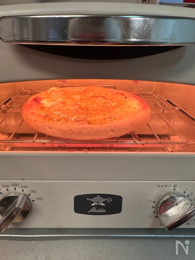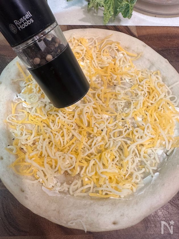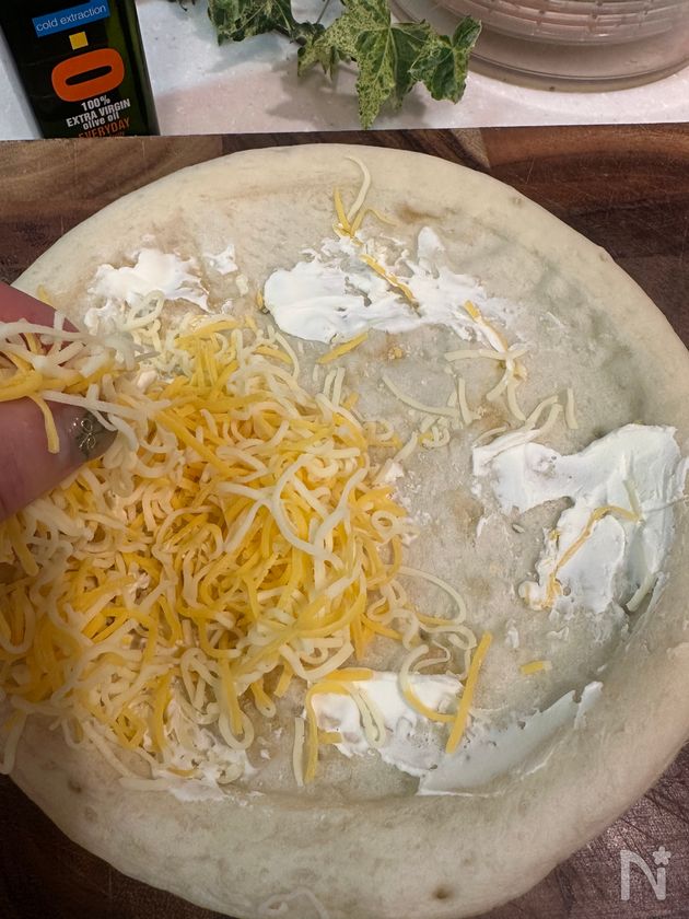 (1) ピザ生地にクリームチーズを全体に塗り、ミックスチーズを全体に広げる。