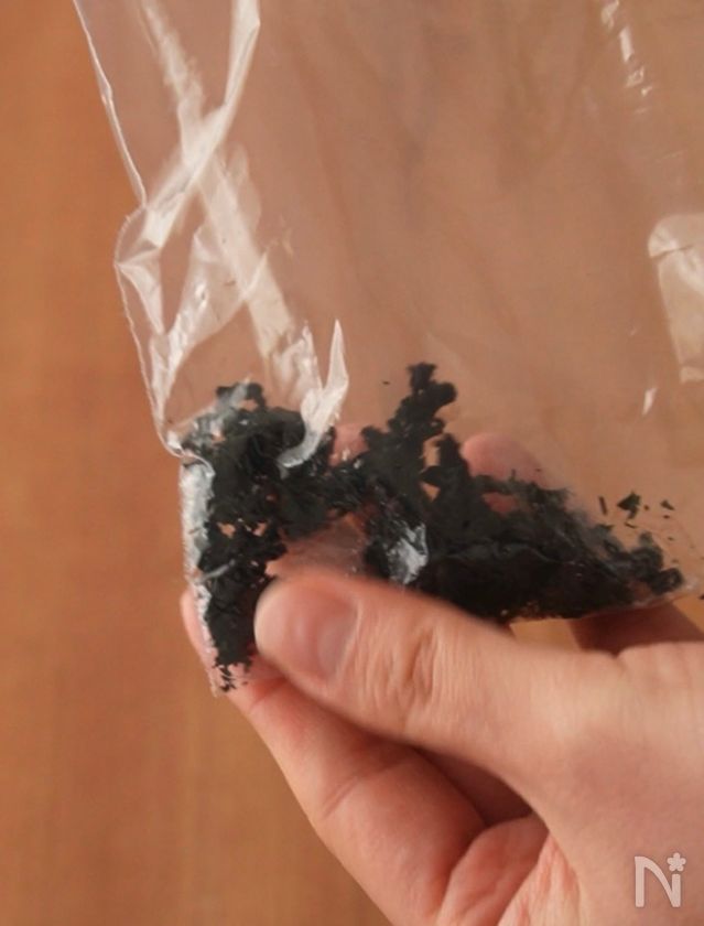 (1) 乾燥わかめを袋にいれ、手で揉み粉砕する。