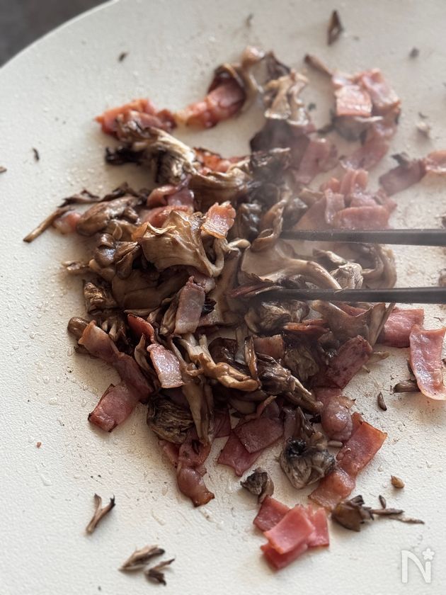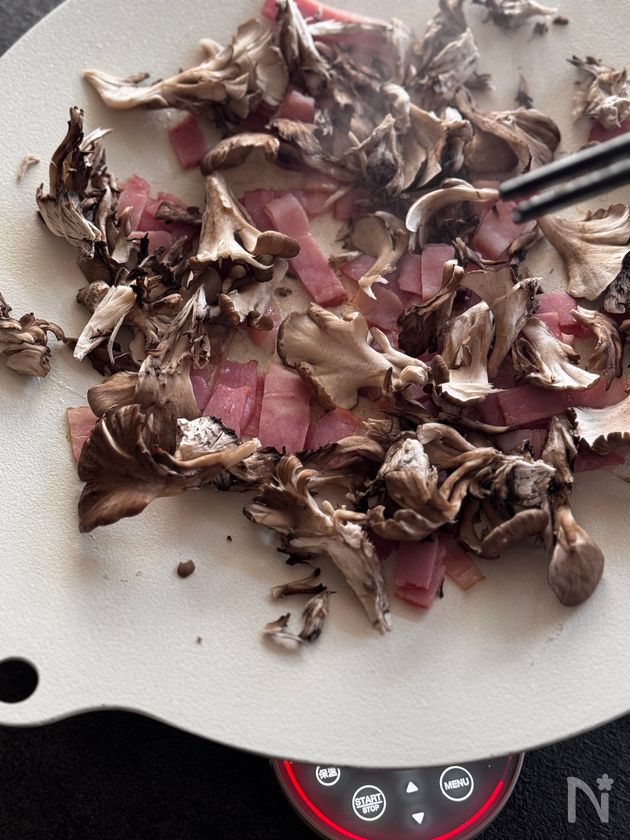 (2) フライパンに米油を中火で熱し、舞茸とハーフベーコンを入れ、動かさないように香ばしくなるまで火を通す。