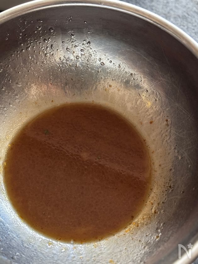 (4) 大きめのボウルに【A】を入れ、よく混ぜる。醤油を入れて混ぜたら味見をする。