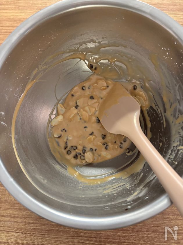 (4) 【E】を加えたら、ゴムベラに持ち替えて混ぜる。
