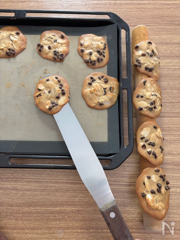 お好みでカーブをつけたい場合は、焼き上がってすぐにめん棒にのせて下さい。