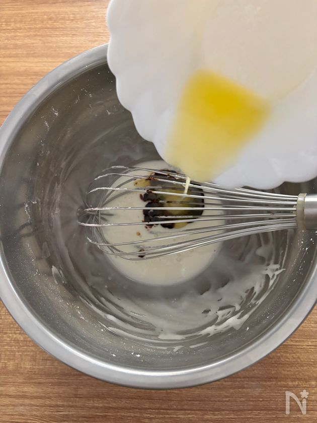 (3) 溶かしておいた【D】と【C】を加えて混ぜる。