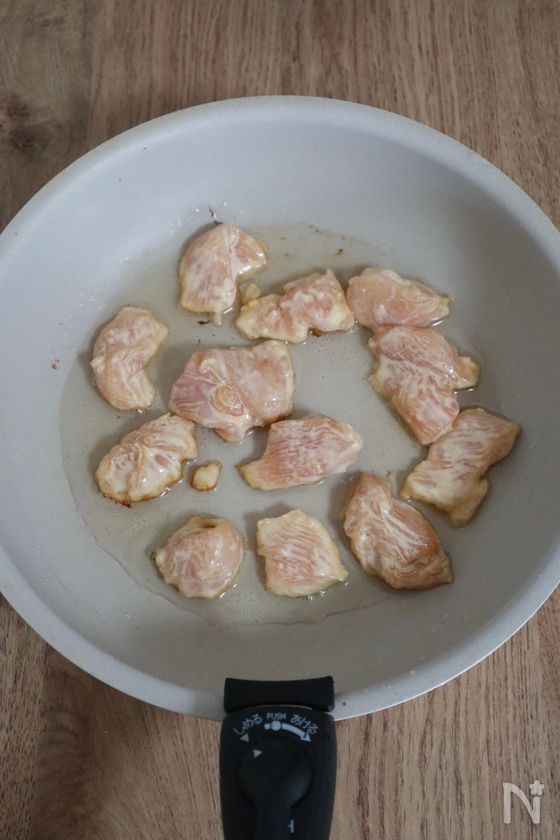 (2) 中火で熱したフライパンにサラダ油を入れたら、①を入れて鶏むね肉にしっかり火が通るまで3分程度揚げ焼きにする。
