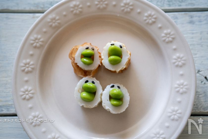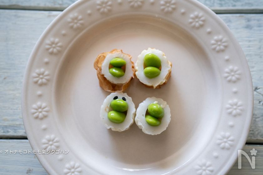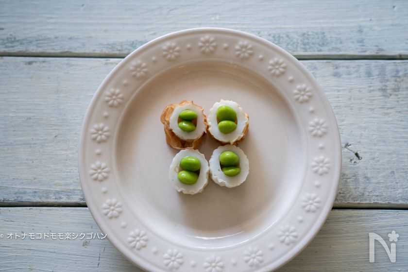(5) 冷凍枝豆をちくわの穴に2個づつ差し込みます。
