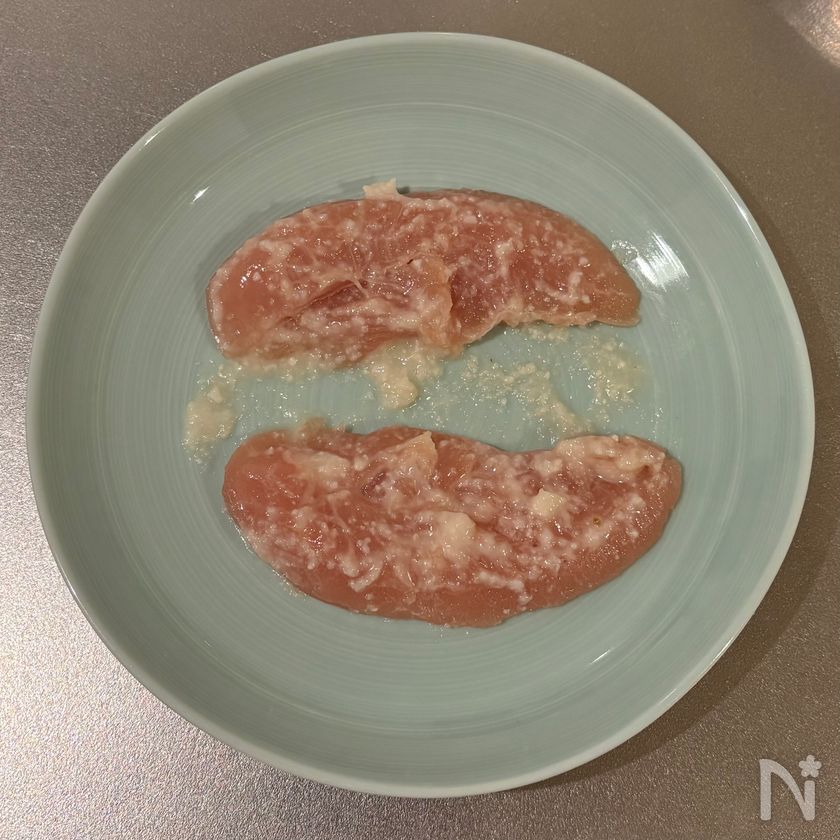 (2) 耐熱容器にささみを並べ、表面に塩麹を塗ったら5分程度おく。