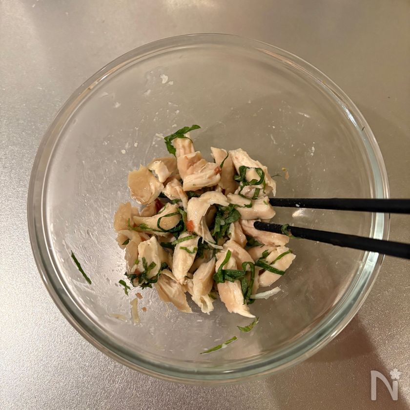 (4) 粗熱が取れたら食べやすく裂き、梅肉・青しそ・いりごまを加えて和える。