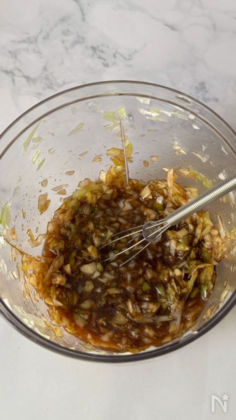 (2) ネギを微塵切りしたら【B】を加え混ぜる。
