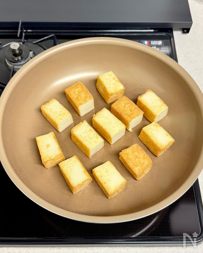 (3) フライパンを中火にかけ、油をひかずに厚揚げを焼く。各面転がしながらカリッと焼き、満遍なく焼き色がついたら器に盛る。