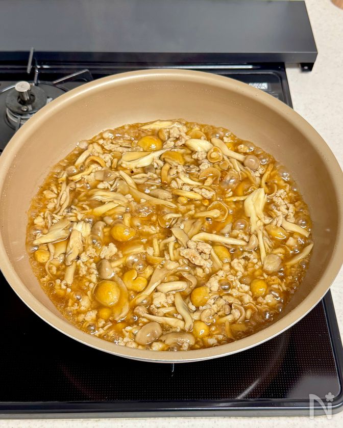 (5) しんなりしたら【B】となめこを入れ、とろみがつくまで混ぜ合わせる。