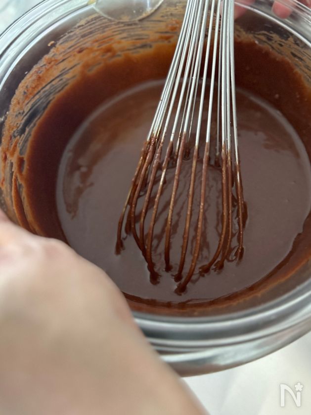 ■バター・チョコレートは、艶が出るまでしっかり混ぜ合わせます。固まりがなくなるまで。