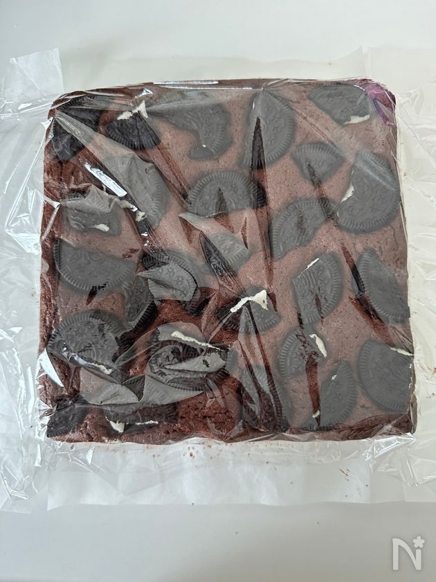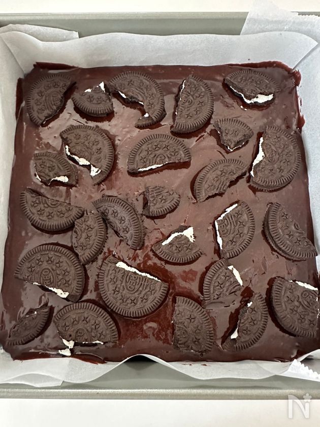 (5) 型に流し込み、生地を平らにならす。オレオを手で砕き入れたら予熱したオーブンで30分焼く。