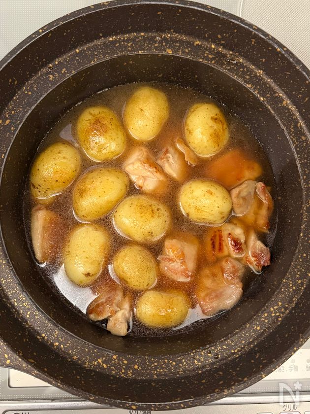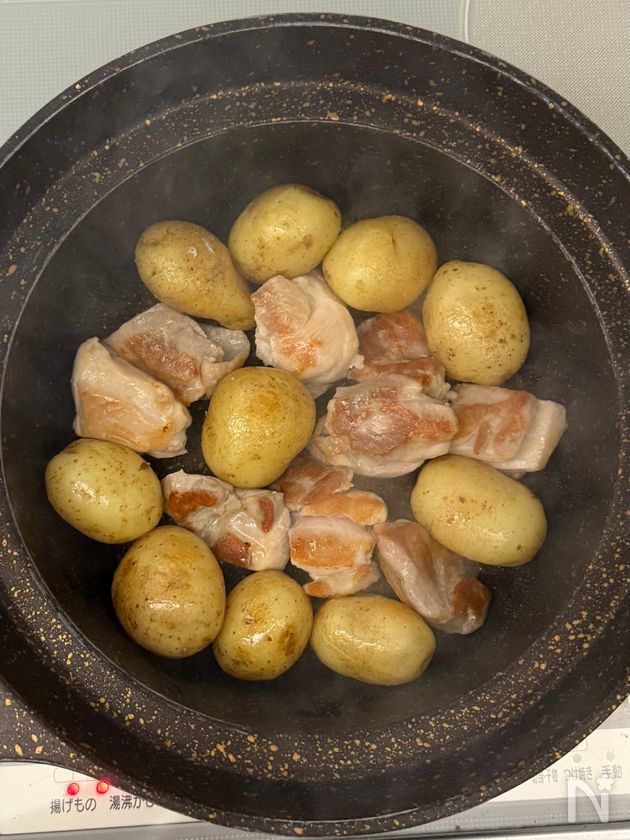 (3) 新じゃがいもを入れ、じゃがいもに焼き色をつける。