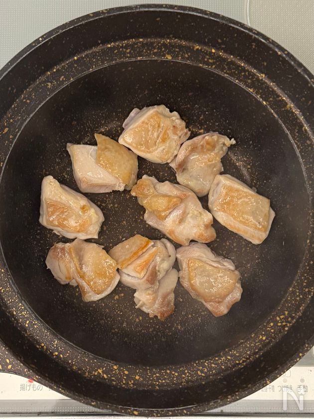 (2) その間に、鍋に、炒め油を小さじ1入れ、中火で、鶏もも肉を皮めから焼き、全体に焼き色をつける。中まで火が通っていなくてよい。