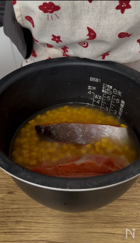 (1) 塩鮭、コーン缶を入れて普通炊飯で炊く。
