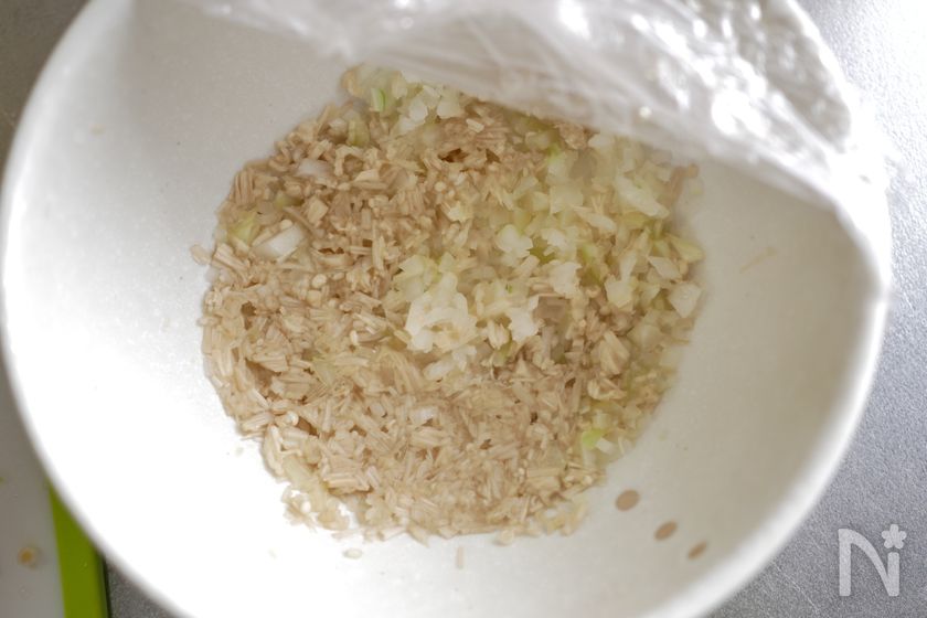 (2) みじん切りにした玉ねぎとえのきをレンジokの器へ入れる。