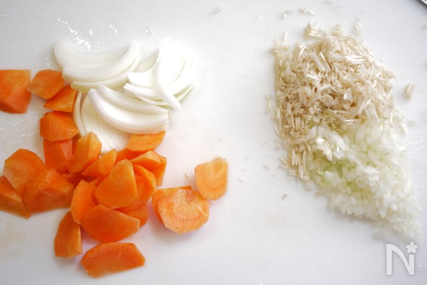 玉ねぎは分量の半分をみじん切り、残りを1cm櫛切りにする。