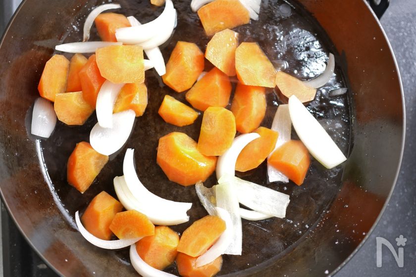 にんじんと櫛形の玉ねぎを入れ塩0.5gを振る。