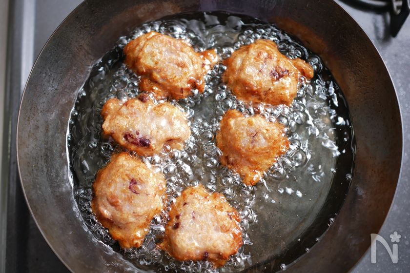 (4) フライパンor鍋へ揚げ油を注ぎ160℃の中温にする、3をスプーン1杯分ずつ入れて、片面2分揚げて火を通す。