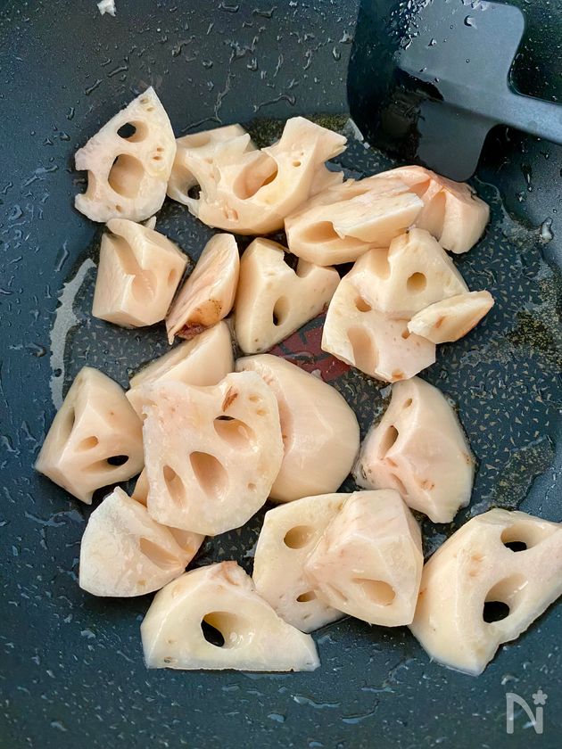 (1) ごま油をひいたフライパンを熱し、蓮根を中火で1分炒める。