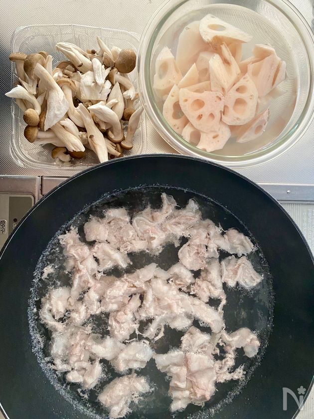 豚肉を茹でている間に、蓮根は乱切りにして水にさらし、しめじは石づきを取り除き、手でほぐしておく。