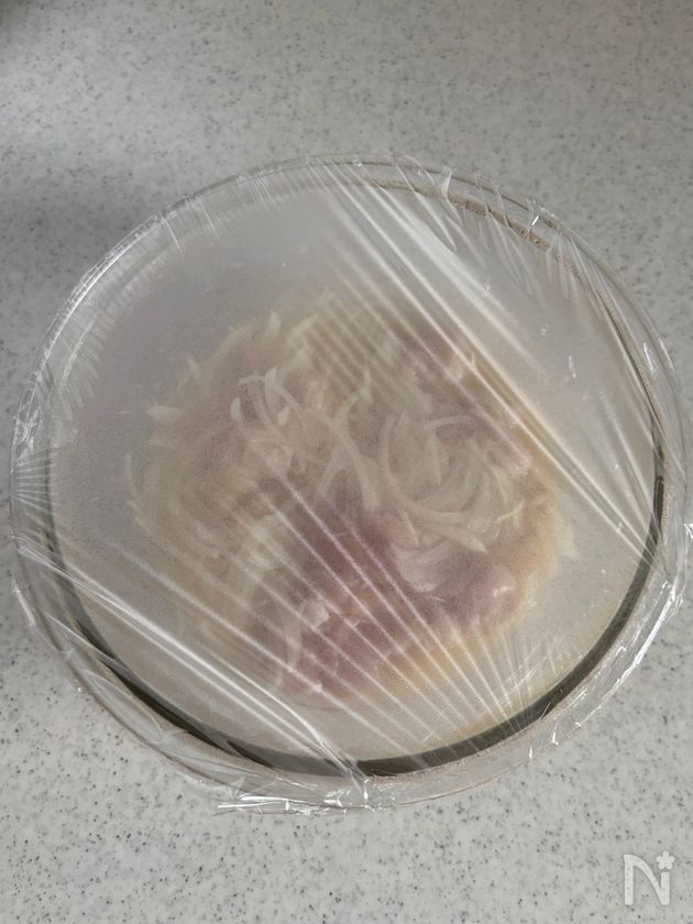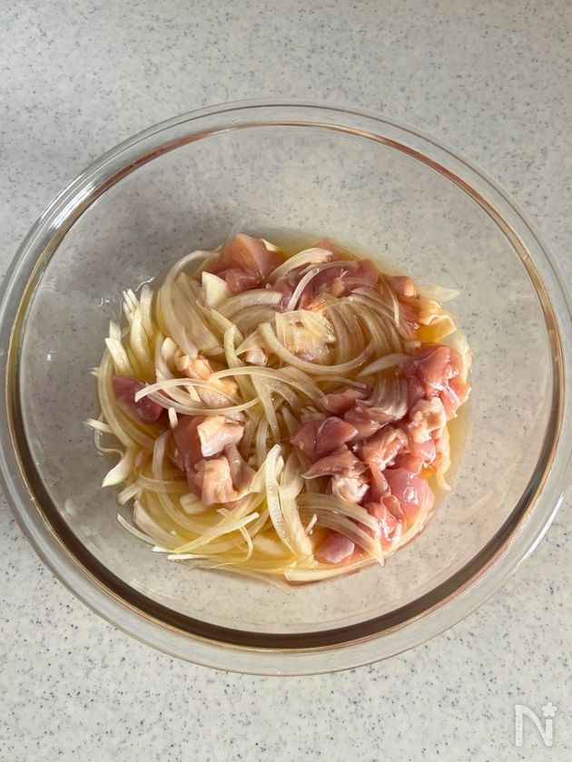 (2) 耐熱ボウルに鶏もも肉・玉ねぎ・【A】を入れて混ぜる。