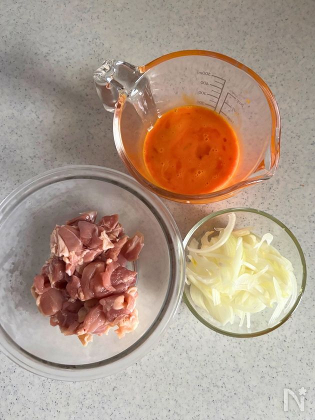 (1) 鶏もも肉は食べやすい大きさに切る。玉ねぎは薄切りにし、卵は溶いておく。