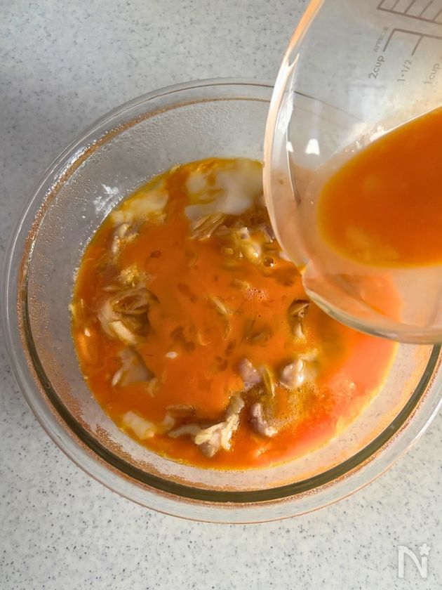 (4) 一度取り出して軽く混ぜ、溶き卵の半量を回し入れる。再びラップをして600Wで1分加熱する。