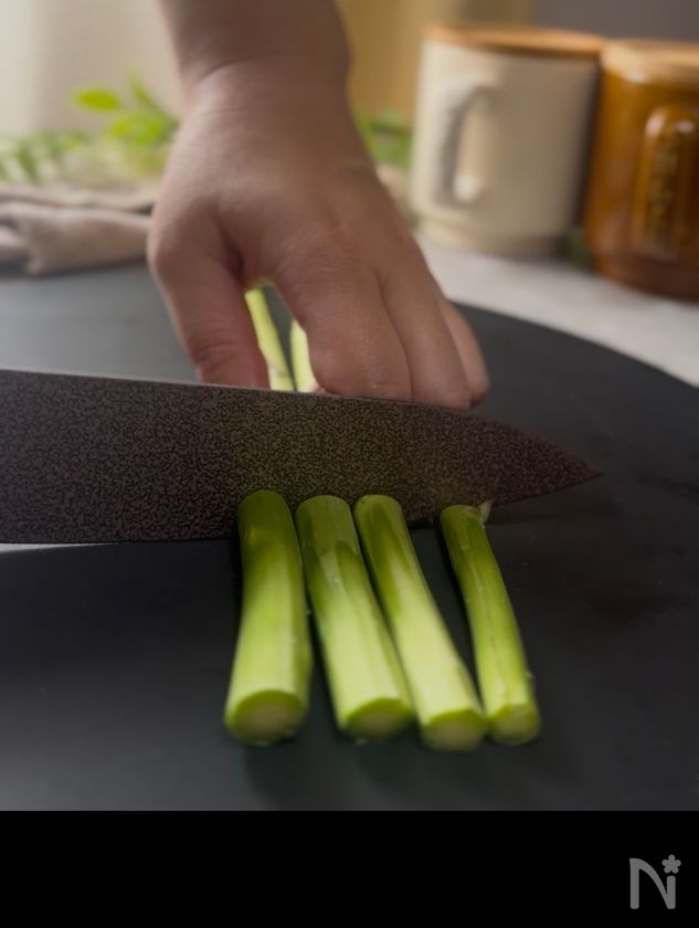 (1) アスパラガスは根本を切って、根本から1/3あたりまで皮を剥き、3等分にする。