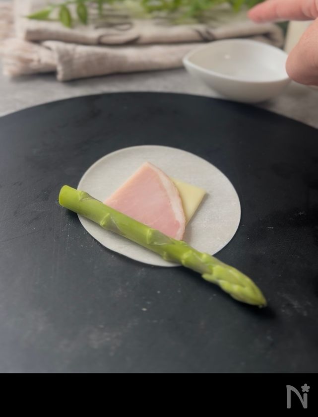 (3) 餃子の皮に、チーズ、ハム、アスパラの順にのせる。巻き終わりに水を塗って、巻いていく。