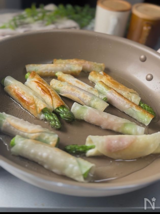 (4) 油を入れて、巻き終わりを下にして並べて、全体に焼き色がつくまで焼く。