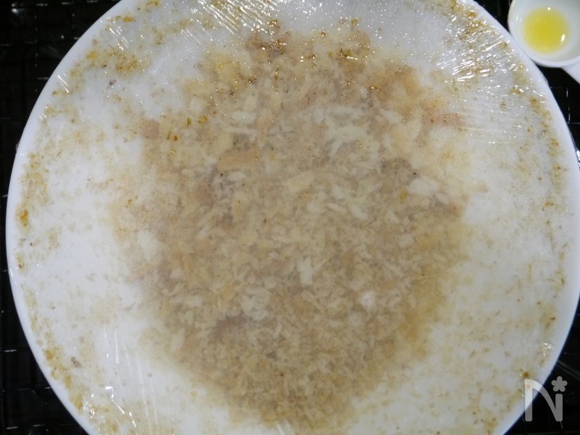(下準備) パン粉大さじ3にオリーブオイル小さじ1を掛けて、レンジ600w1分20秒加熱して焼きパン粉を作る。
