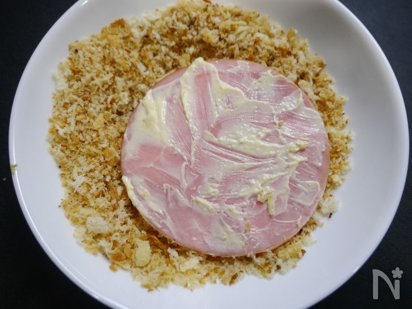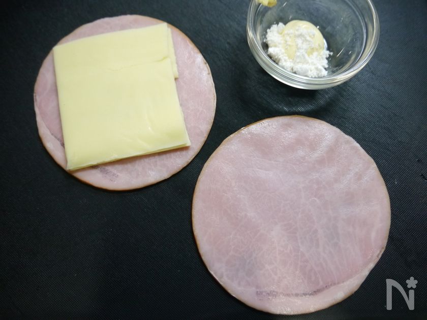 (2) マヨネーズ小麦粉を混ぜて、ハムに塗って焼きパン粉を付ける。