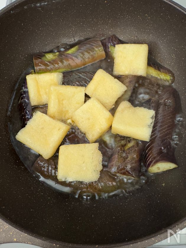 (2) 1のフライパンに【A】と油揚げを入れ、落し蓋と蓋をして、弱火で5分煮る。