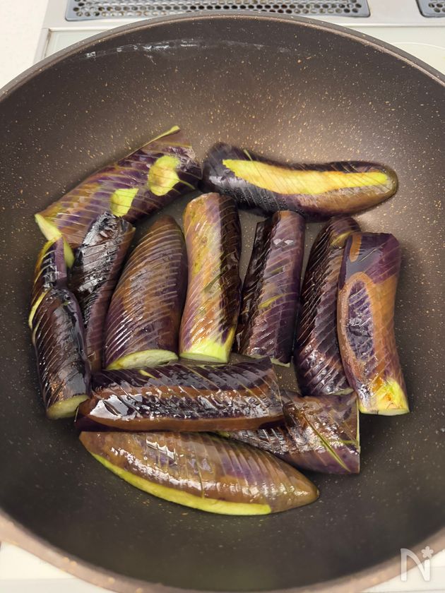 (1) なすにごま油をまぶし、フライパンに皮目を下にして並べる。蓋をして弱火~弱めの中火で3分加熱する。裏返してさらに3分加熱する。