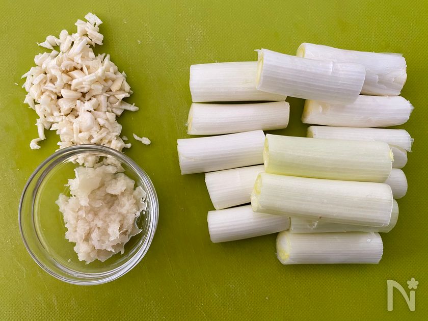 (下準備) 長ねぎは3~4㎝のぶつ切りにする。