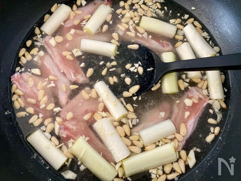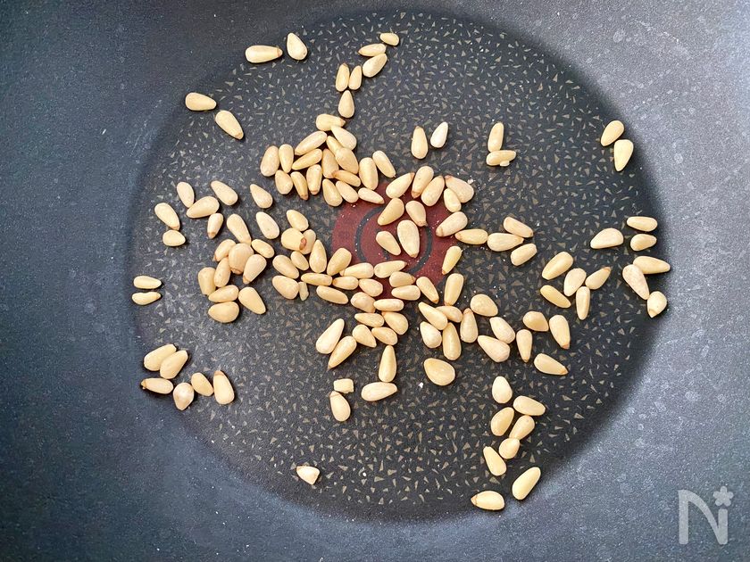 (1) 深めのフライパンかお鍋で松の実を乾煎りする。