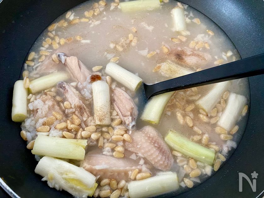 (3) ご飯を加え、塩こしょうで味を整えたら、10分~15分、長ねぎに火が通るまで煮込む。