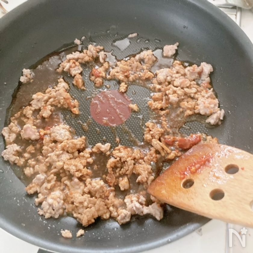 香りが立ってきたら、豚ひき肉を加え、色が変わったら、