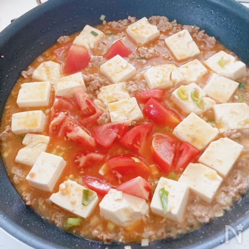 (4) トマトを加えひと煮立ちしたら、水溶き片栗粉でとろみをつけ、ごま油を加え火を止める。