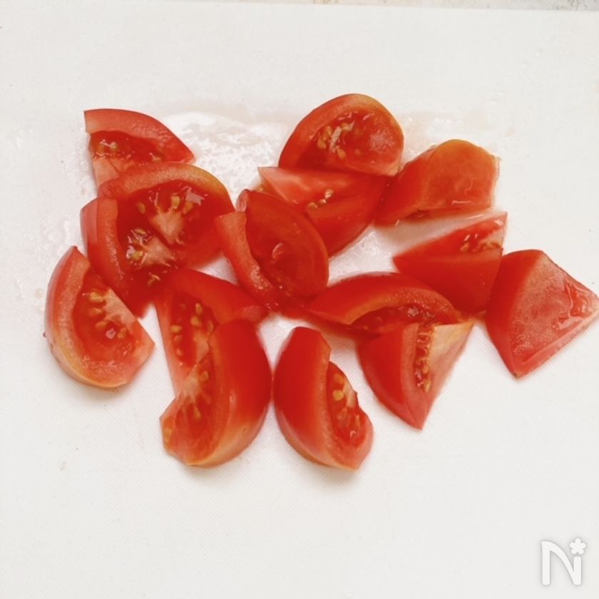 (1) トマトは8等分のくし形に切った後、斜め半分に切る。