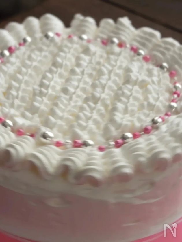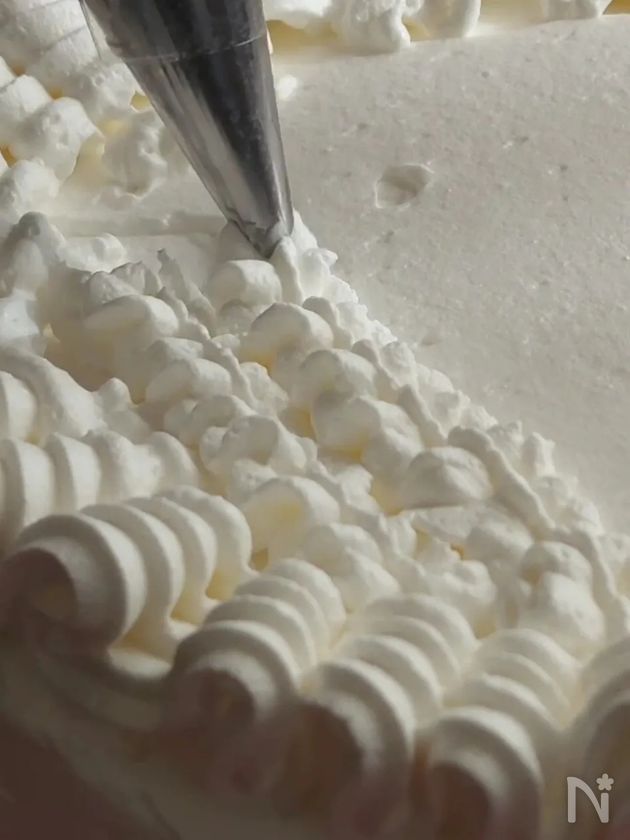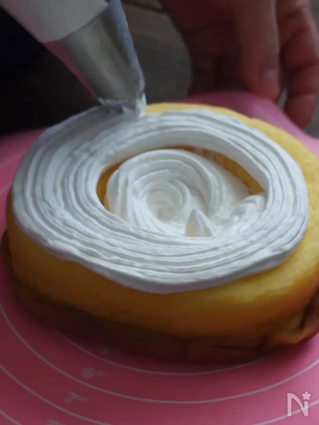 (3) 上面にホイップクリームを絞る。(今回は周囲をフリルっぽく、中は小さい口金を使用。)