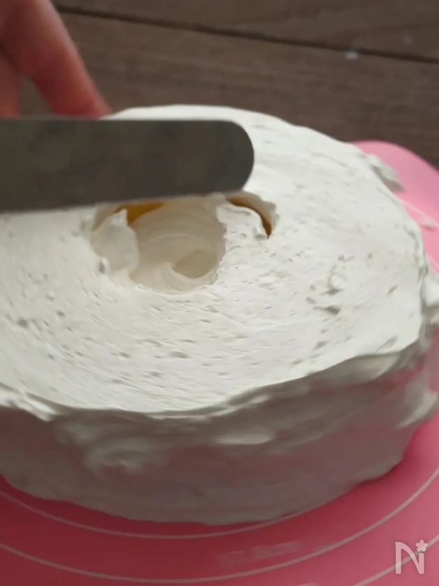 (2) 全体にクリームを絞ったらスパチュラなどで平らにする。