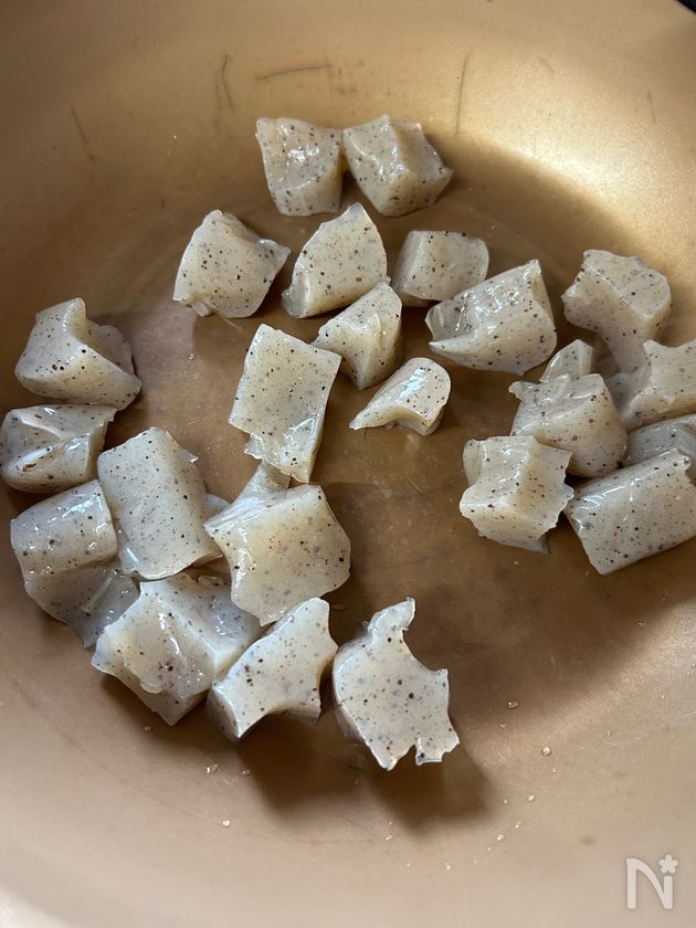 (1) 熱したフライパンにこんにゃくを入れ、きゅっきゅっと音が鳴るまで炒める。(油は使用せずで大丈夫です。)
