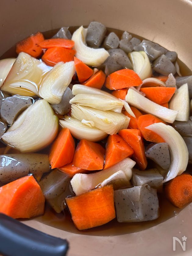 (2) にんじんと玉ねぎを入れて、そこに【A】も加える。