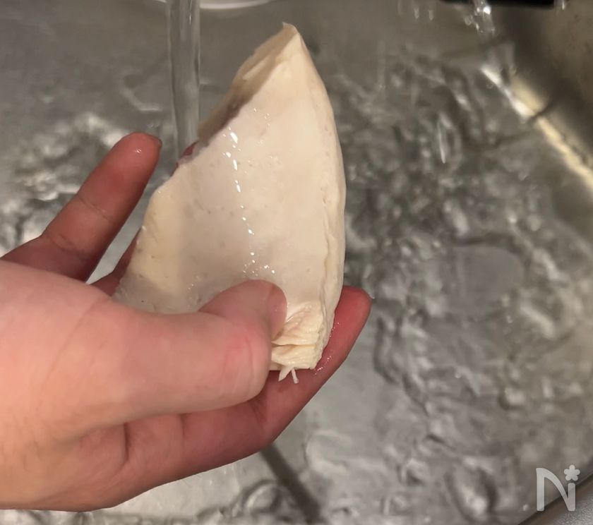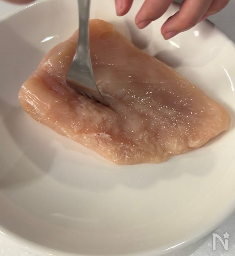 (1) 鶏むね肉はフォークで両面を刺して、穴を開け、酒をふる。