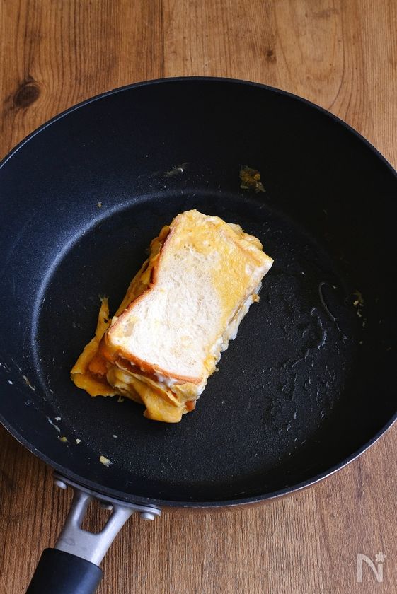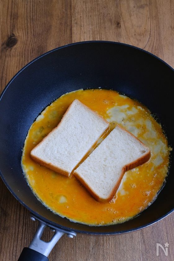 (1) フライパンに弱火でバターを溶かし、溶き卵を流し入れ、パンを真ん中に並べて置く。
