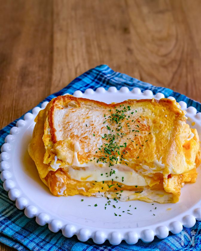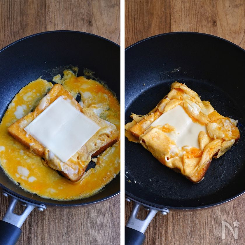 (2) すぐにパンのみ裏返し、スライスチーズ(溶けるタイプ)を乗せ、卵が固まってきたら周りの卵を折りたたんで乗せる。