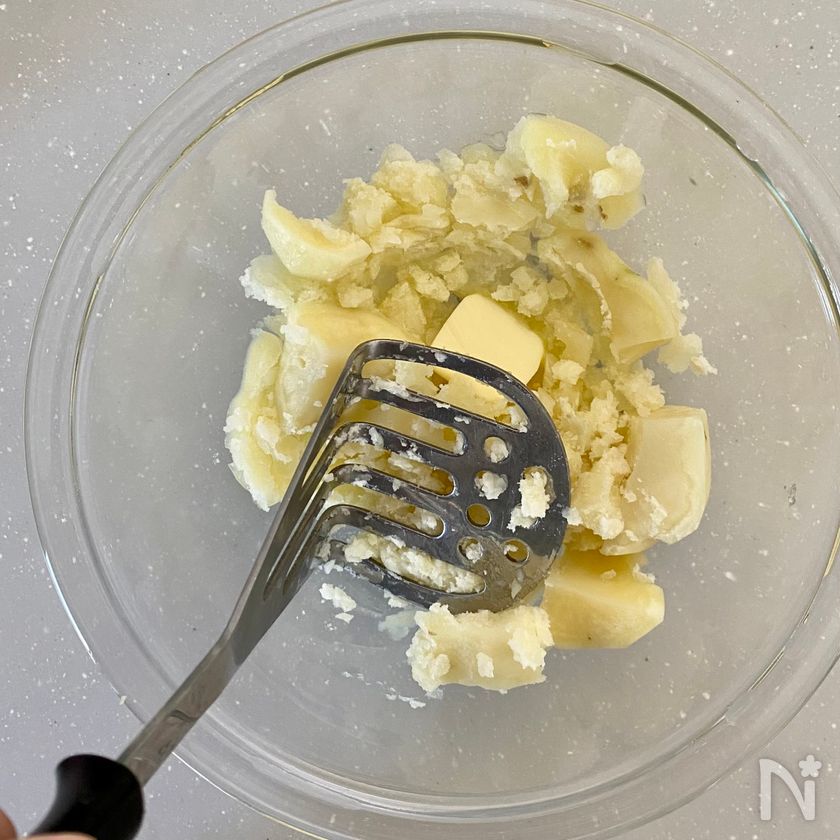 (3) 1をマッシャーやフォークで潰し、熱いうちにバターを入れ、混ぜ合わせて溶かす。