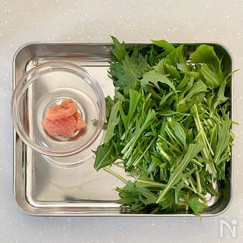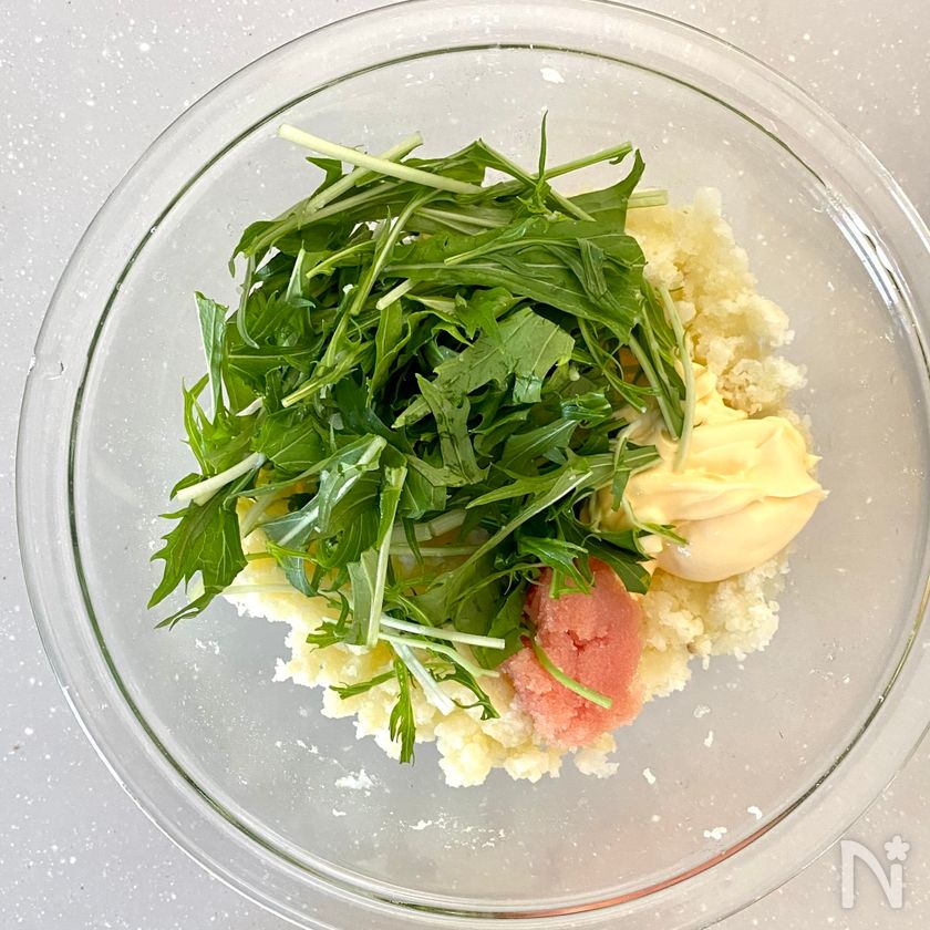 (4) 粗熱が取れたらたらこと水菜と【A】を入れて全体的に和えて、塩胡椒で味を整える。